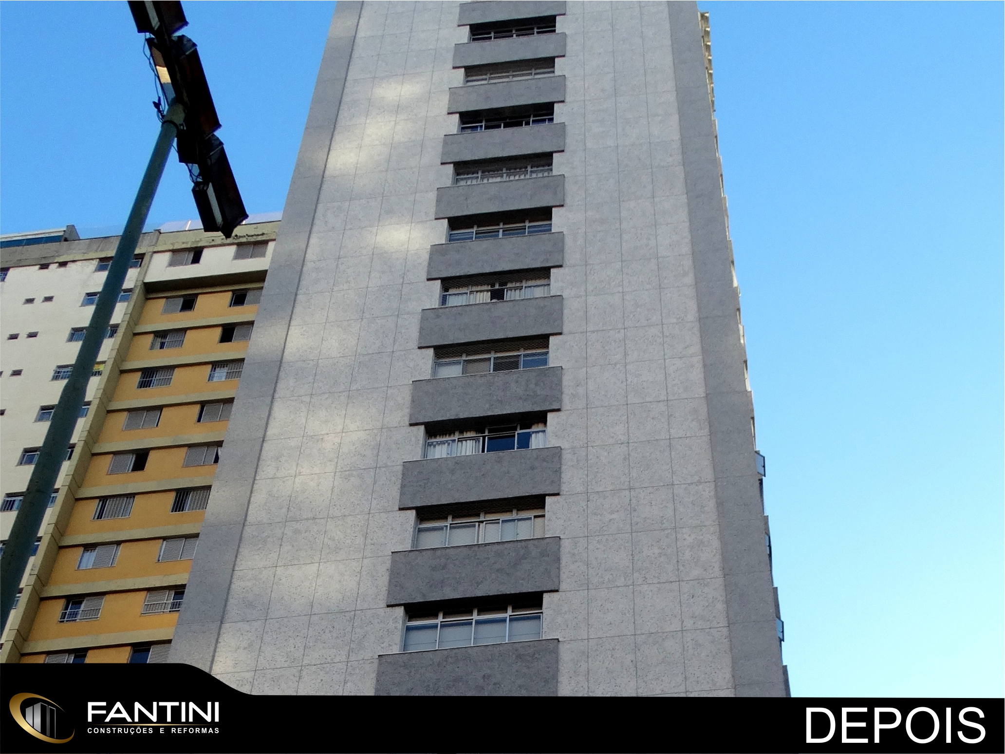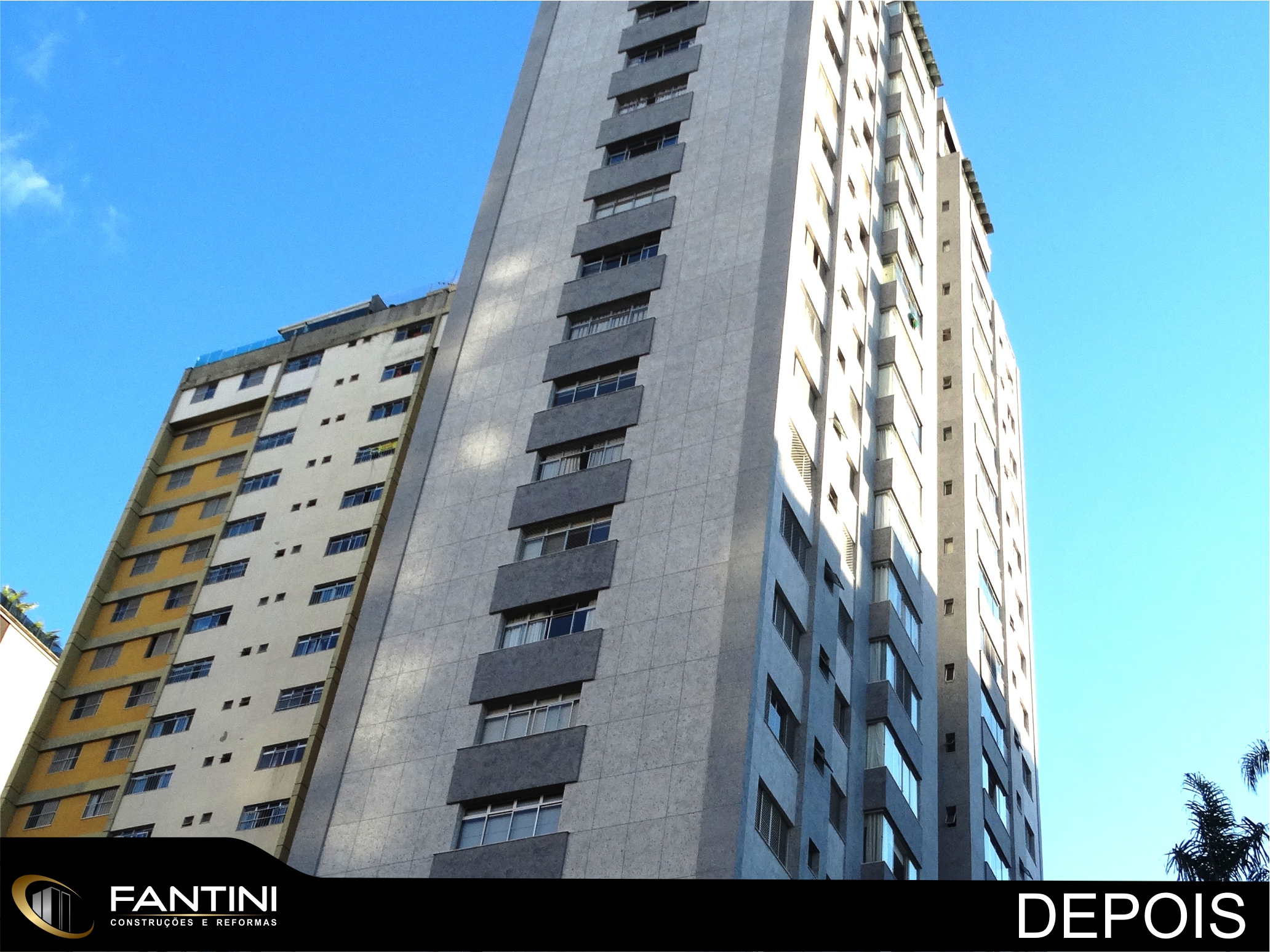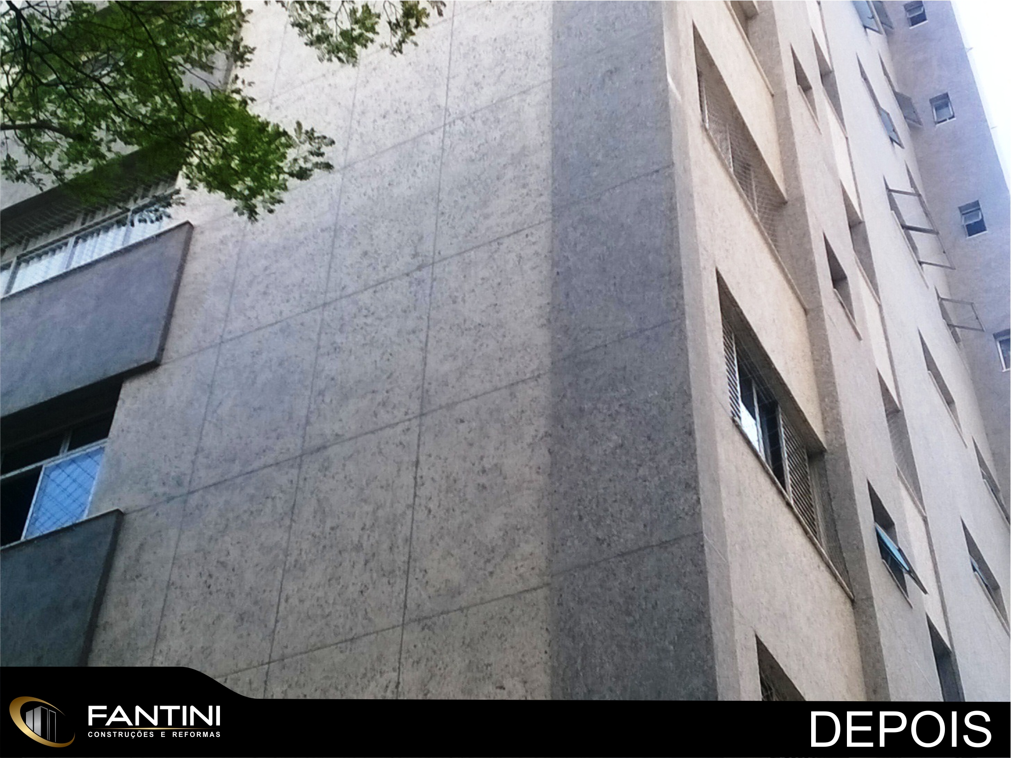 serviço: Reforma completa de fachada predial com remoção total de cerâmica e aplicação de novo revestimento Ecogranito, impermeabilização de pilotis, construção de novo sistema hidráulico do prédio e reforma da entrada do prédio.